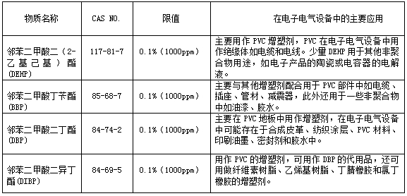 表一. RoHS 2.0新增4项邻苯二甲酸酯物资清单