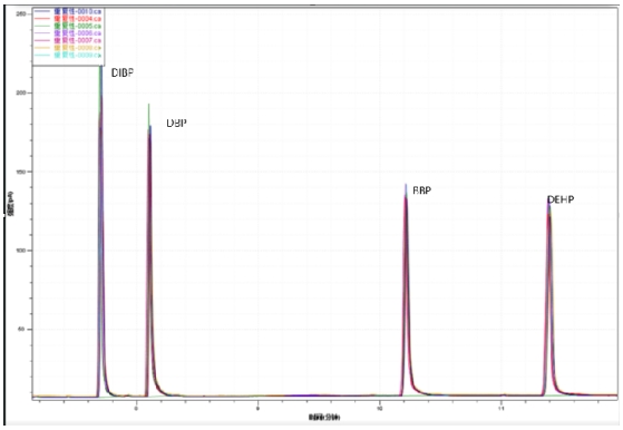 图3. 4种邻苯二甲酸酯类规范溶液反复性谱图叠加图
