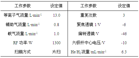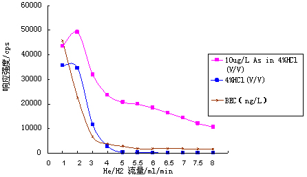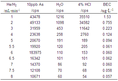 仪器起首在规范形式下停止参💮数优化(操纵10μg·L-1的Li、Co、In、U、Ce调谐液对仪器任务参数停止调理,使仪器活络度高,同时氧化物及双电荷产率小于3%);再开启He/H2碰撞反映气,慢慢增大He/H2流量,测试超纯水、4%HCl及10μg·L-1 As(4%HCl介质)在75amu处的呼应旌旗灯号,计较其背景等效浓度(具体数据见表1及图1);并操纵As标液进一步优化He/H2流量,获得仪器任务参数如表2所示。