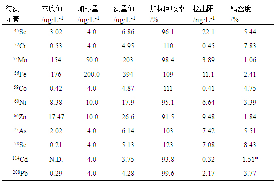在仪器优化任务参数前提下,对样品溶液及加标样液停止测试,计较其加标收受接管率;对样品空缺溶液平行测定7次,以三倍空缺旌旗灯号规范误差/活络度对应的浓度为检出限;同时对样品溶液平行测定11次(距离2min),计较其绝对规范误差,考查精密度,数据见表4。各元素✃检出限在0.41-22.07ng/L之间,加标收受接管率在93.82%-123.10%之间,精密度在1.06%-8.43%之间。